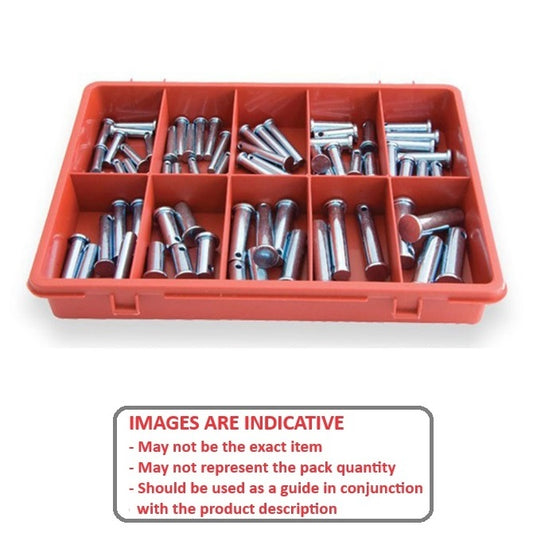 | Material: Carbon Steel Also includes: 1/2 diameter x 1.1/2 and 1.3/4 inch long - 4 each Also includes: Supplied in grey metal box drawer - open - no lid | ||||||