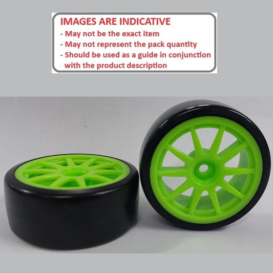 RC Car Wheels Hobby - Rim Colour Green 10 Spoke - Black Tenth Scale - Plastic Wheel 1 pack (2 pcs) Available Now | Item Discontinued - Up to 1 may be ordered online. No backorders. Please contact us if you need a larger quantity Regular price